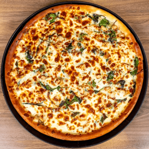 Our authentic Greek pizza includes an olive oil-garlic base, spinach leaves, onions, tomatoes, and feta cheese