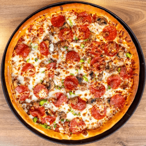 Our signature pizza includes pepperoni, sausage, ground beef, mushrooms, onions, and green peppers