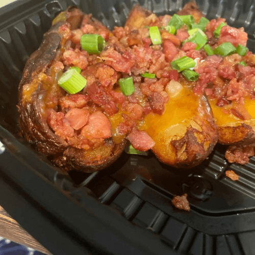 Fried chicken strips, choices of no salad, house, or Caesar. Side options include baked or sweet potatoes, broccoli & cauliflower, fries, grilled veggies, and onion rings.