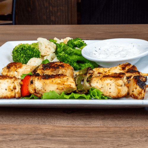 Marinated chicken served with grilled onion, and green peppers