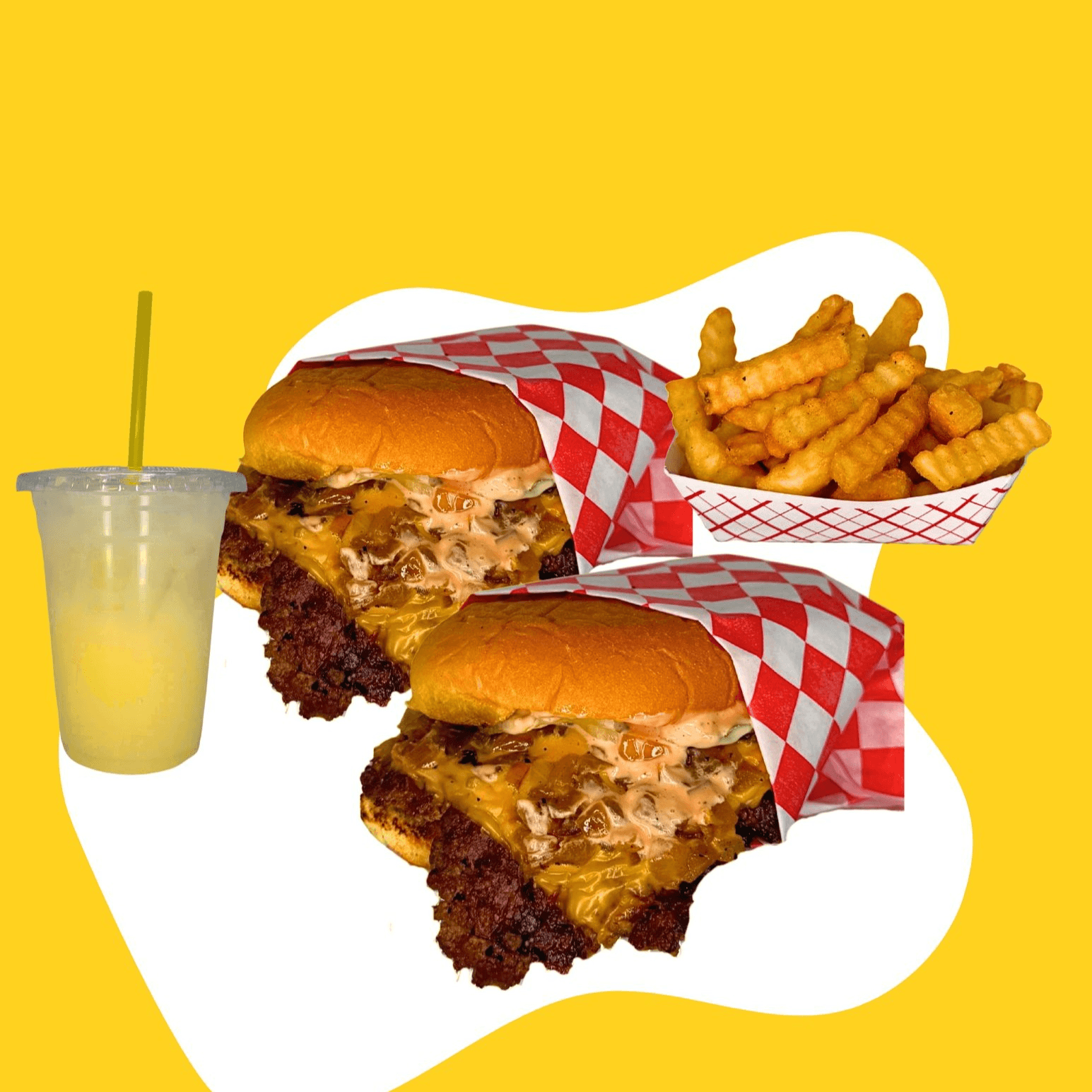 2 Smash Burgers, large fries & a drink (bottled soda or house lemonade)