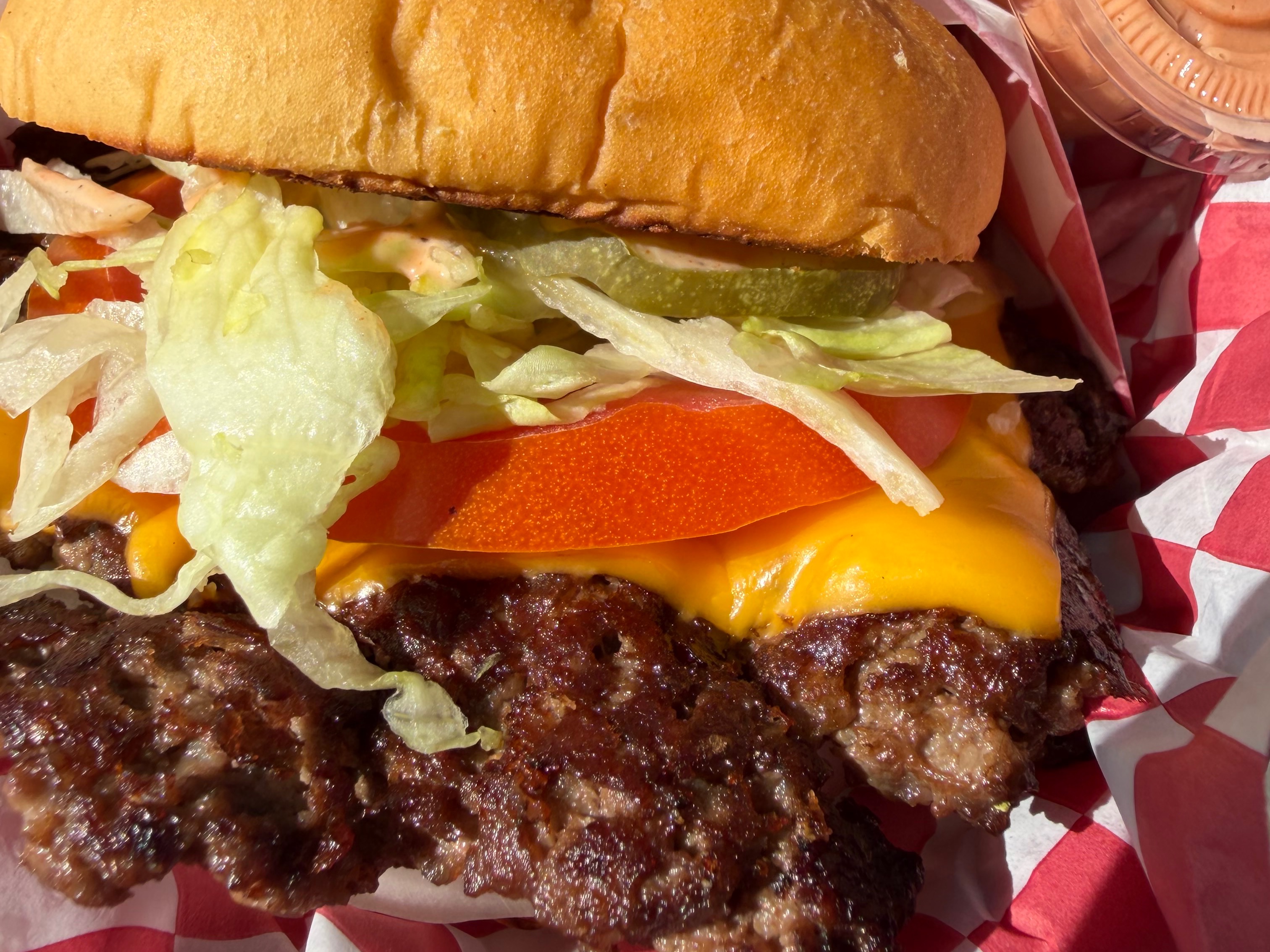 Double Smash Burger w extra cheese, grilled onions, pickles and sauce served on Texas Toast!